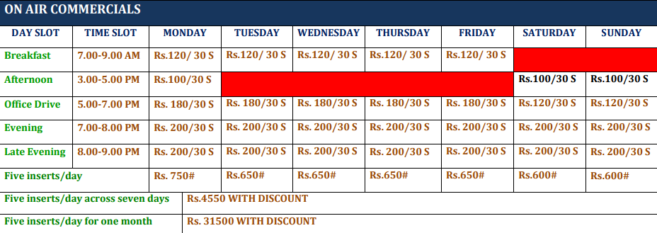 You may want to submit only the written copy. We will convert it into an attractive commercial. Please submit such a copy at least 10 days in advance for us to record the commercial and schedule it properly. In such cases, we charge an additional Rs. 200 (one time) fee only. You also get a copy of your commercial!